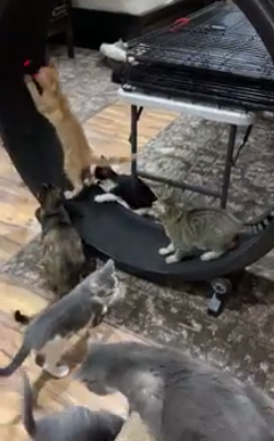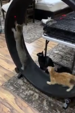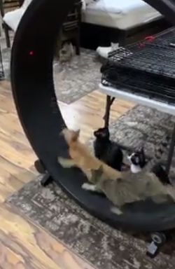 Recently, an owner chased his kittens around the giant hamster wheel, and all of them jumped in to enjoy the ride. When the owner started to move the wheel, one of the kittens jumped in to enjoy the ride, and then all of them began jumping in.