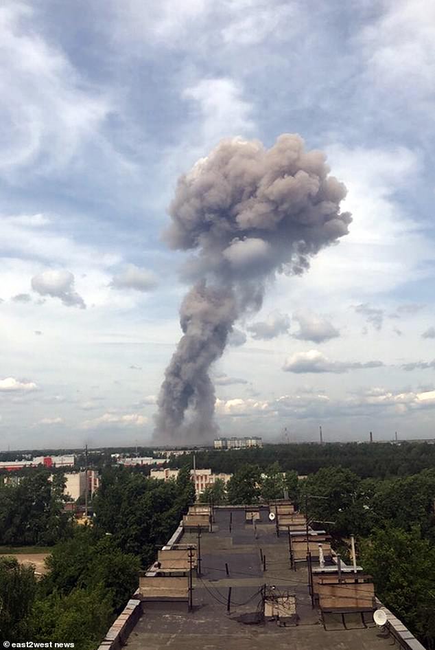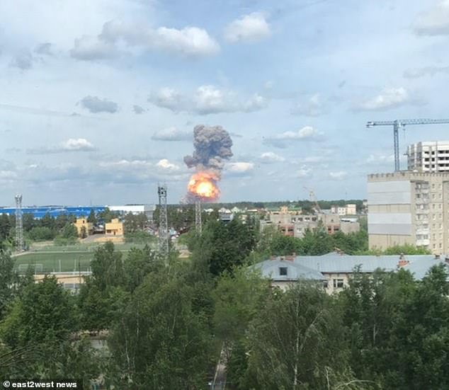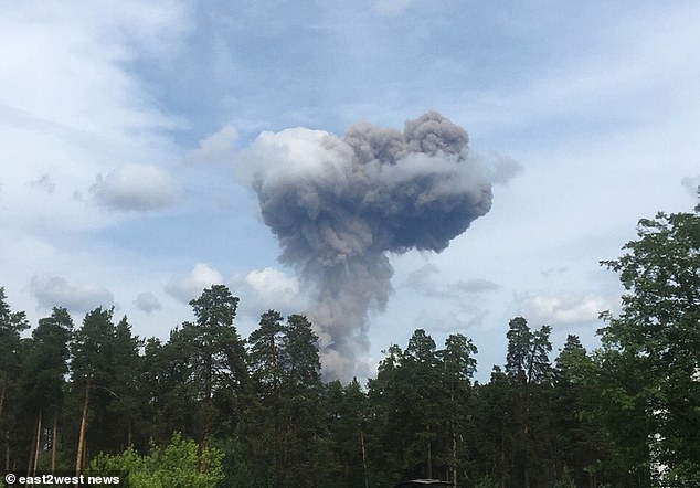 A mushroom cloud erupted over the city of Dzerzhinsk, east of Moscow, Russia after the explosion at Russian TNT factory.