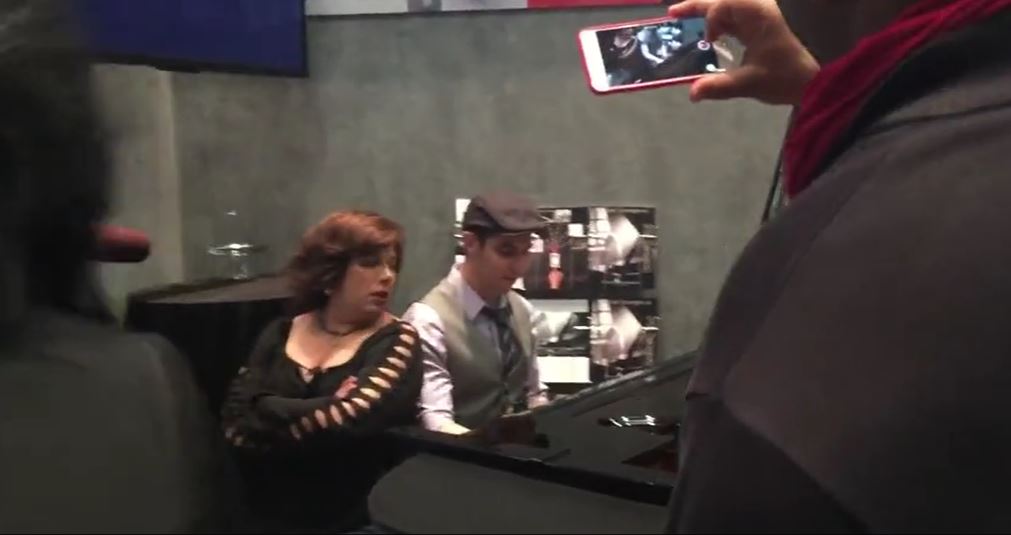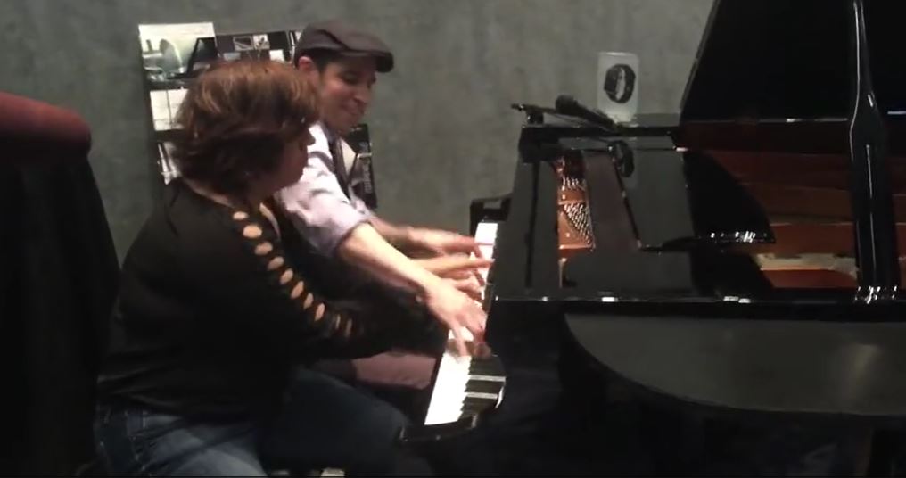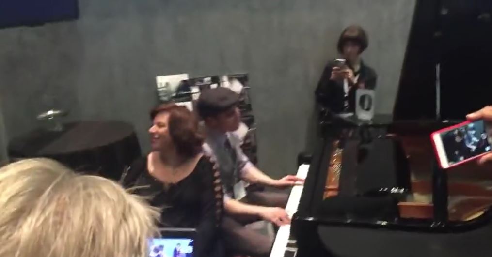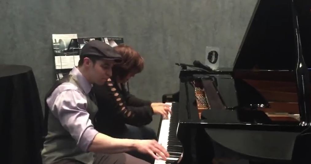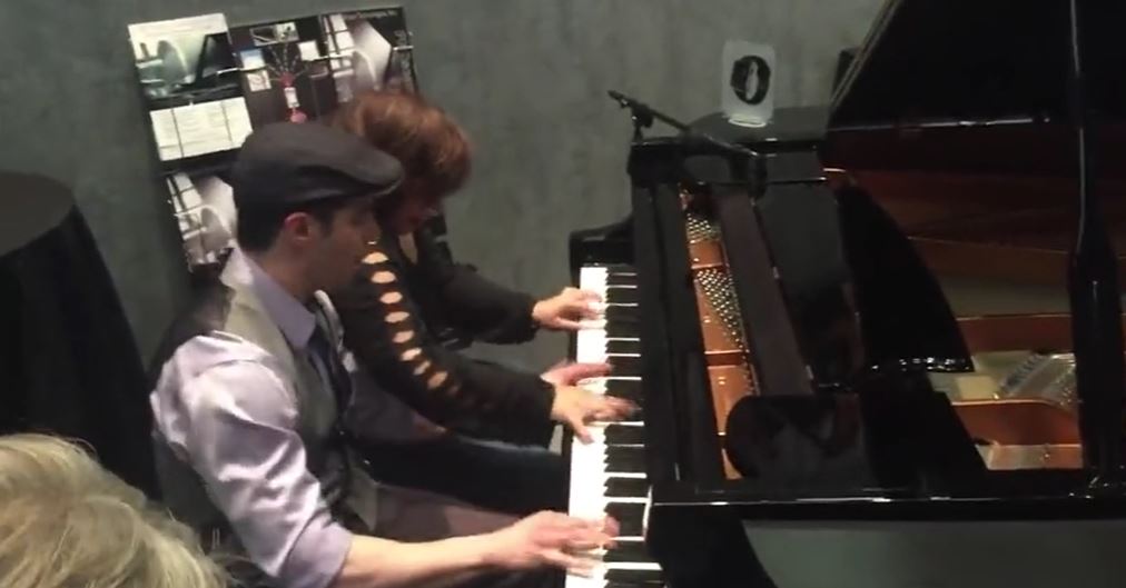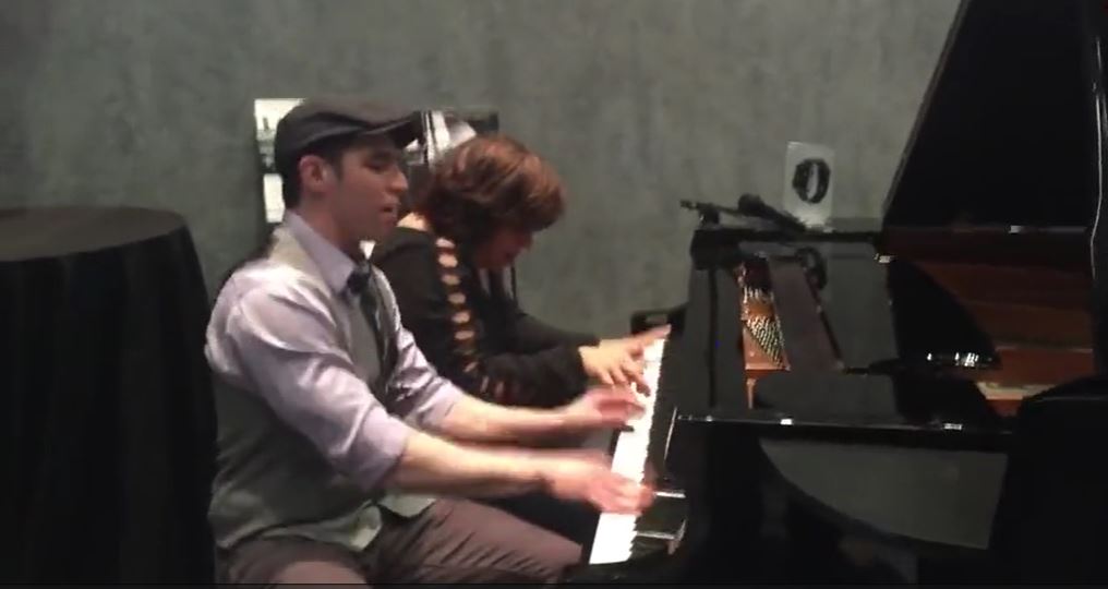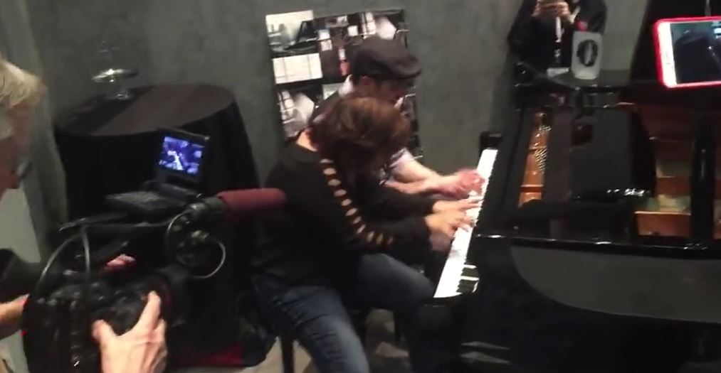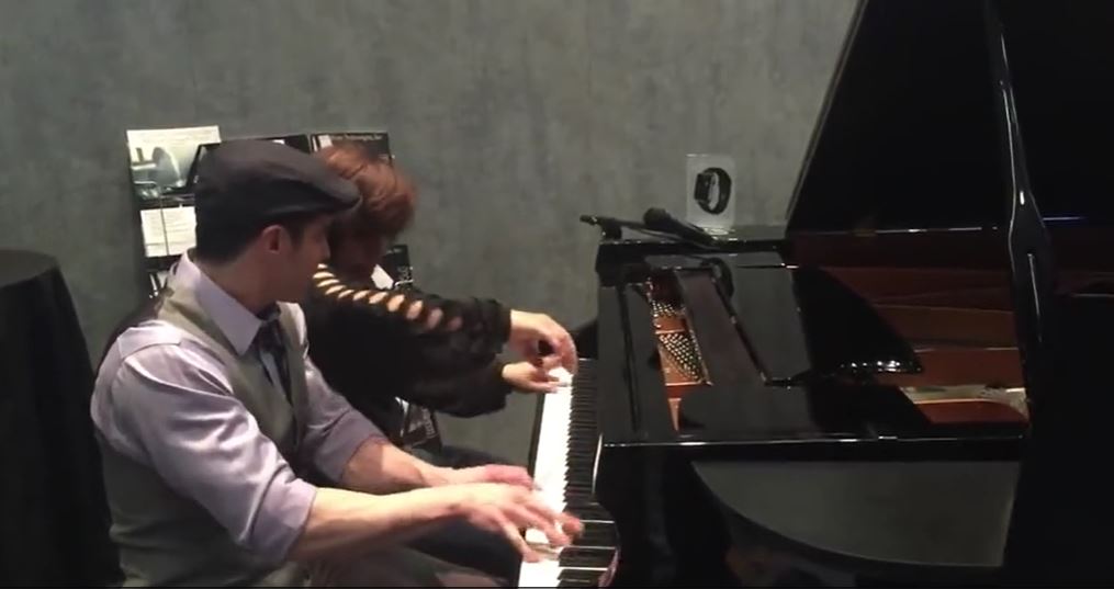 The duo begins playing the piano like these people have performed for their whole life.