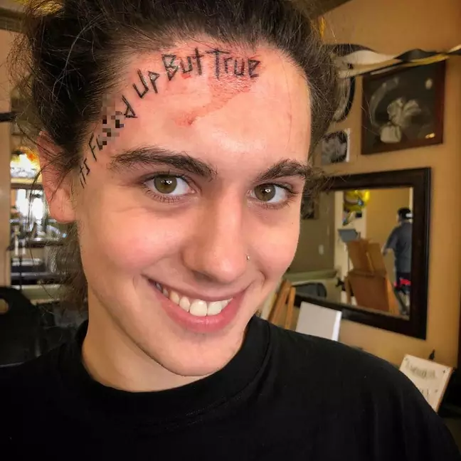 A 19-year-old from the US has a tattoo on his face which reads “it’s f***ed up but true” – and he got the questionable phrase inked because magic mushrooms ‘told him’ to do so.