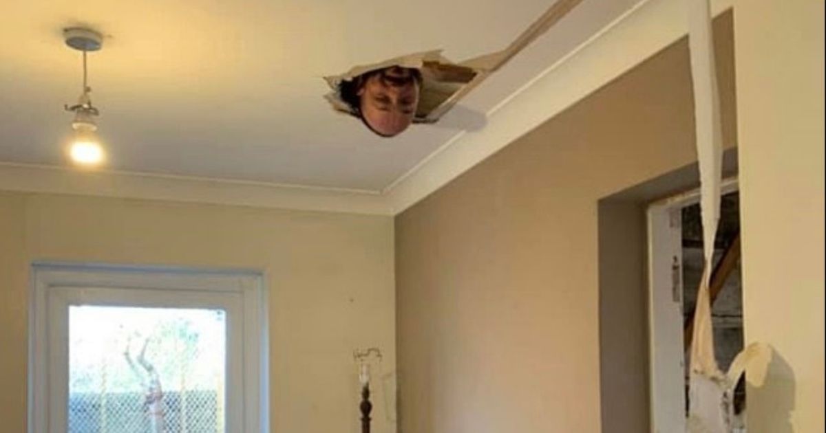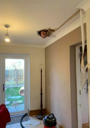 The man’s partner, Ashleigh Poulter, took a picture of him where his head was seen popping out of the ceiling.