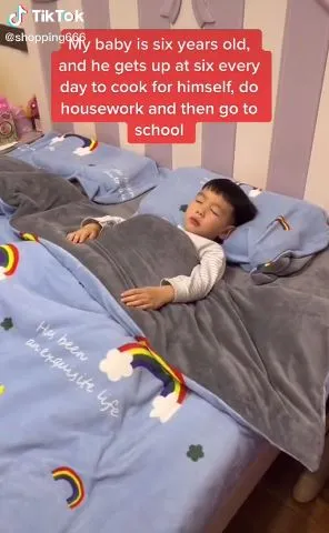 In a TikTok video shared by his mom, who goes under the username @shopping666, the little boy can be seen jumping out of his bed at 6 am.
