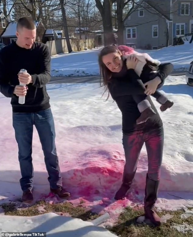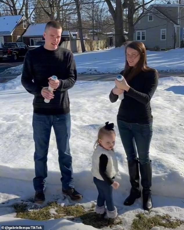 The hilarious video shows both Gabrielle and her husband holding the blasters outside their front lawn, which happened to be covered in snow.