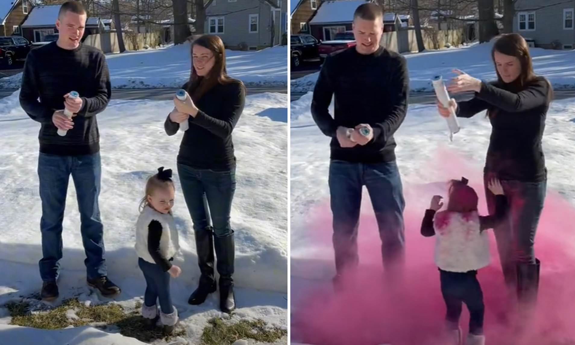 The blasters filled with pink powder were held in an upside-down position by the expecting mother but she failed to realize her error until the end.