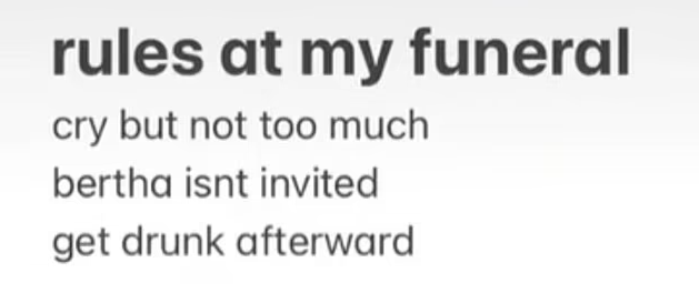 “These are my rules at my funeral,” she says in her viral video. “Listen up!”