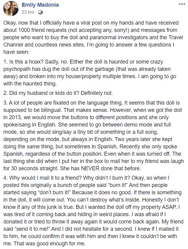 “Is this a hoax? Sadly, no. Either the doll is haunted or some crazy psychopath has dug the doll out of the garbage (that was already taken away) and broken into my house/property multiple times. I am going to go with the haunted thing,” she added.