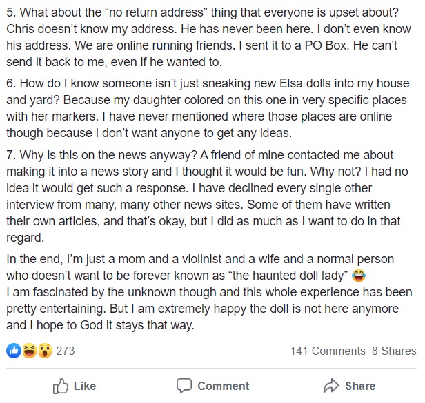 “We went out of town, forgot about it. Today Aurélia says ‘Mom, I saw the Elsa doll again in the backyard.’ HELP US GET RID OF THIS HAUNTED DOLL.”