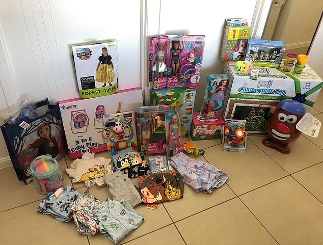 In photos of the large pile of gifts, one can see presents such as clothes, costumes, LEGOs, dolls, a climber, and more.