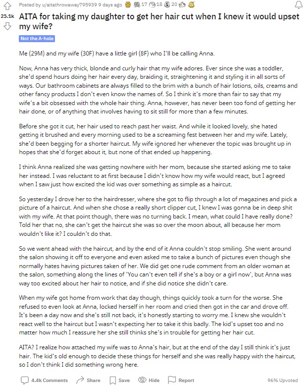 “While it looked lovely, she hated getting it brushed and every morning used to be a screaming fest between her and my wife. Lately, she’d been begging for a shorter haircut. My wife ignored her whenever the topic was brought up in hopes that she’d forget about it, but none of that ended up happening.”
