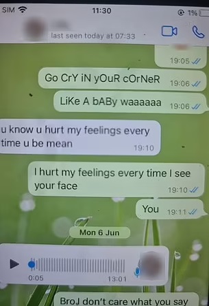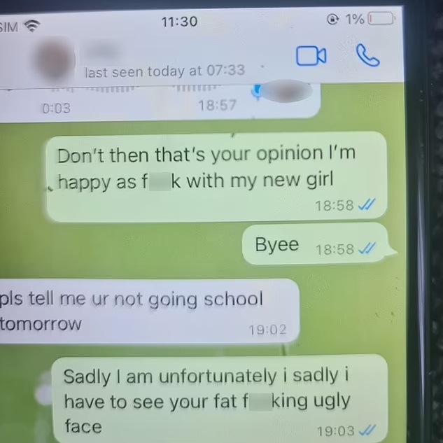 “He’d sent this girl texts saying ‘I never want to see your ugly face in school. Your ugly face and fat body offend me.’ She’d text him back saying ‘Stop being horrible to me.’ He’d sent voice notes as well going ‘Urgh, you’re disgusting,’” Samm added.