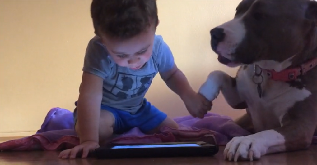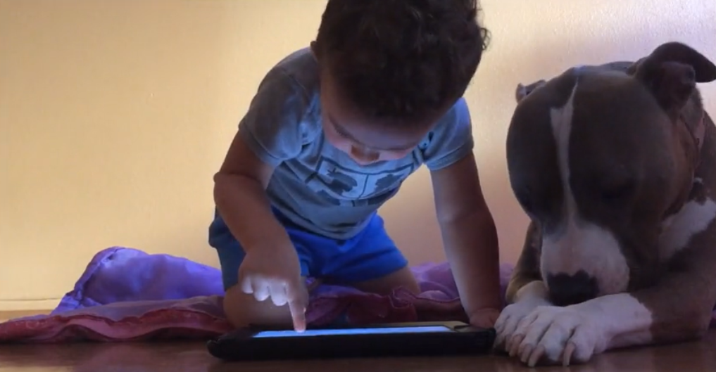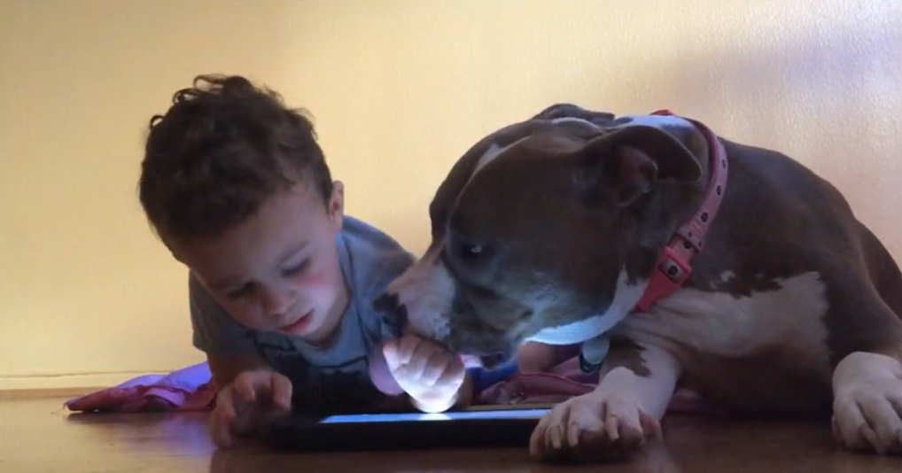 To steal the attention away from the iPad she starts kissing her best friend. She licks him and keeps licking him to get his attention but the little boy and her best friend keep getting away because he is too busy with his iPad.