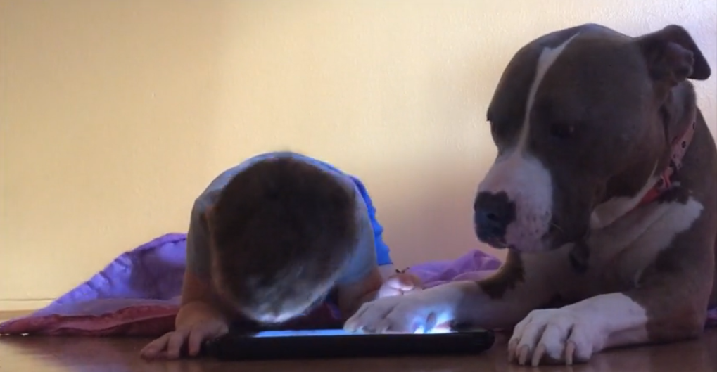 Gemma gets so irritated that she even tries to cover the screen with her paw but the little boy took her paw and pushed it away to have a better look. Gemma’s kisses could not work on this one.