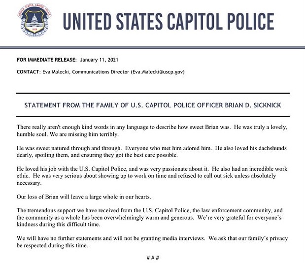 “Our loss of Brian will leave a large hole in our hearts. The tremendous support we have received from the US Capitol Police, the law enforcement community, and the community as a whole has been overwhelmingly warm and generous. We’re very grateful for everyone’s kindness during this difficult time,” the statement added.