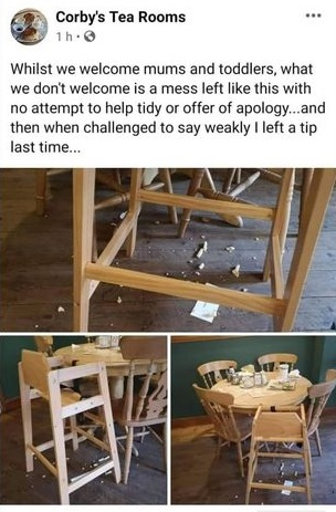 “Whilst we welcome mums and toddlers, what we don’t welcome is a mess left like this with no attempt to help tidy or offer of apology and then when challenged to say weakly, ‘I left a tip last time.’”