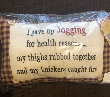 The post accompanied an image of the offensive present that stated, “I gave up jogging for health reasons… my thighs rubbed together and my knickers caught fire.”