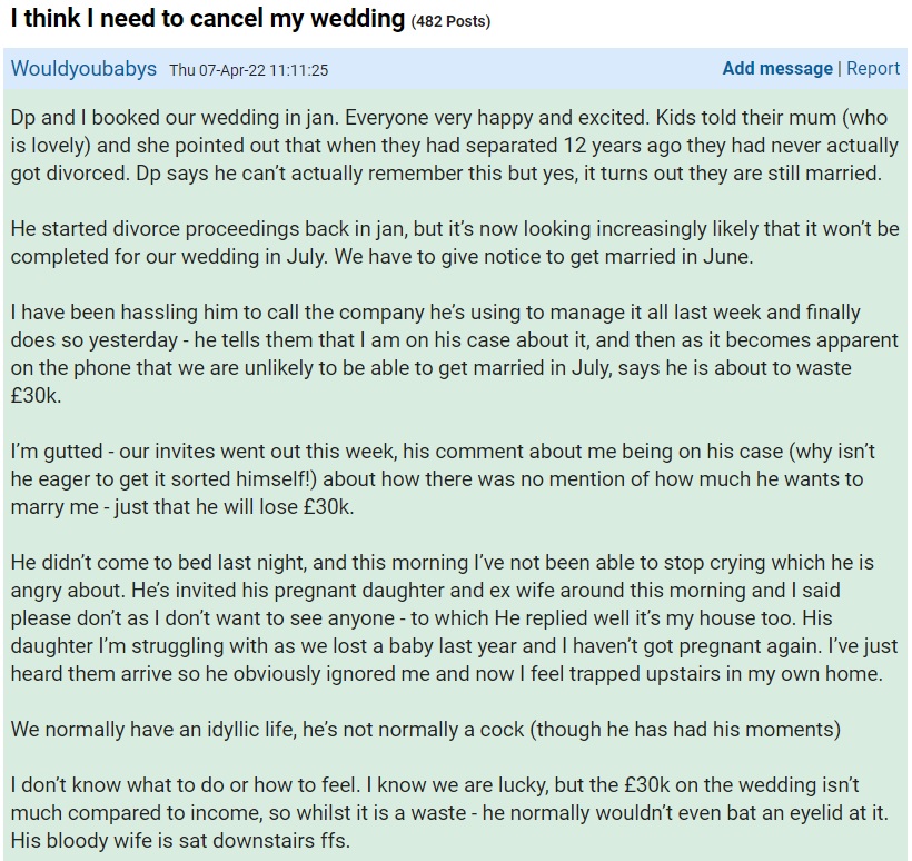 “He and I booked our wedding in Jan. Everyone very happy and excited. Kids told their mum (who is lovely) and she pointed out that when they had separated 12 years ago they had never actually got divorced. He says he can’t actually remember this but yes, it turns out they are still married,” the woman wrote.