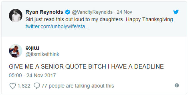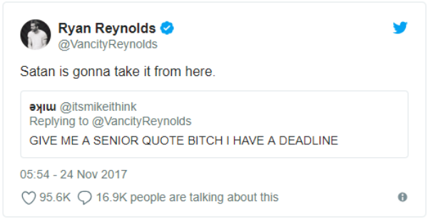 Twitter user @itsmikeithink asked Reynolds back in November, rather forcefully, for a senior quote, tweeting at Reynolds “GIVE ME A SENIOR QUOTE BITCH I HAVE A DEADLINE.”