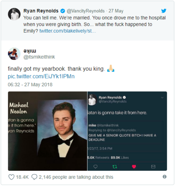 And now, eight months later Mike is the proud owner of a yearbook containing his photo and quote. Sending a photo of the yearbook and the original tweet to Reynolds, Mike wrote: “Finally got my yearbook. thank you, king.”‘