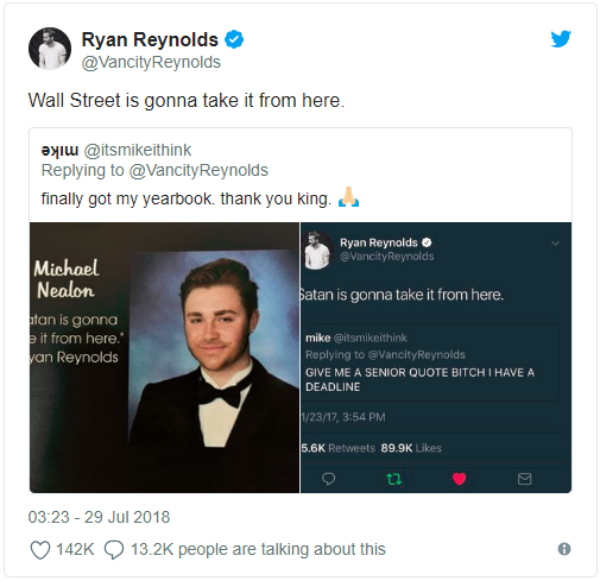 Reynolds – riffing off his original quote, ‘Satan is gonna take it from here,’ wrote to the fan, ‘Wall Street is gonna take it from here.’