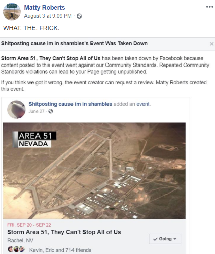 Matty Roberts, founder of the most iniquitous ‘Storm Area 51, They Can’t Stop All of Us’ has told that the event has been removed and deleted from one of the popular Social Media Platforms, Facebook.
