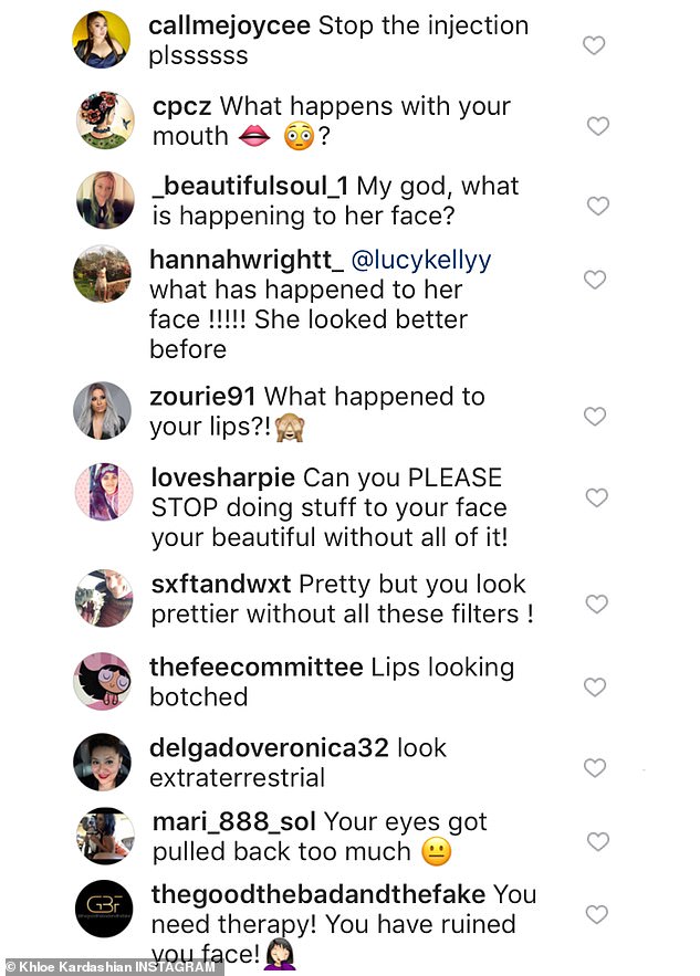 ‘Khloe, stop doing work to your face. You were fine the way you were,’ someone else wrote.