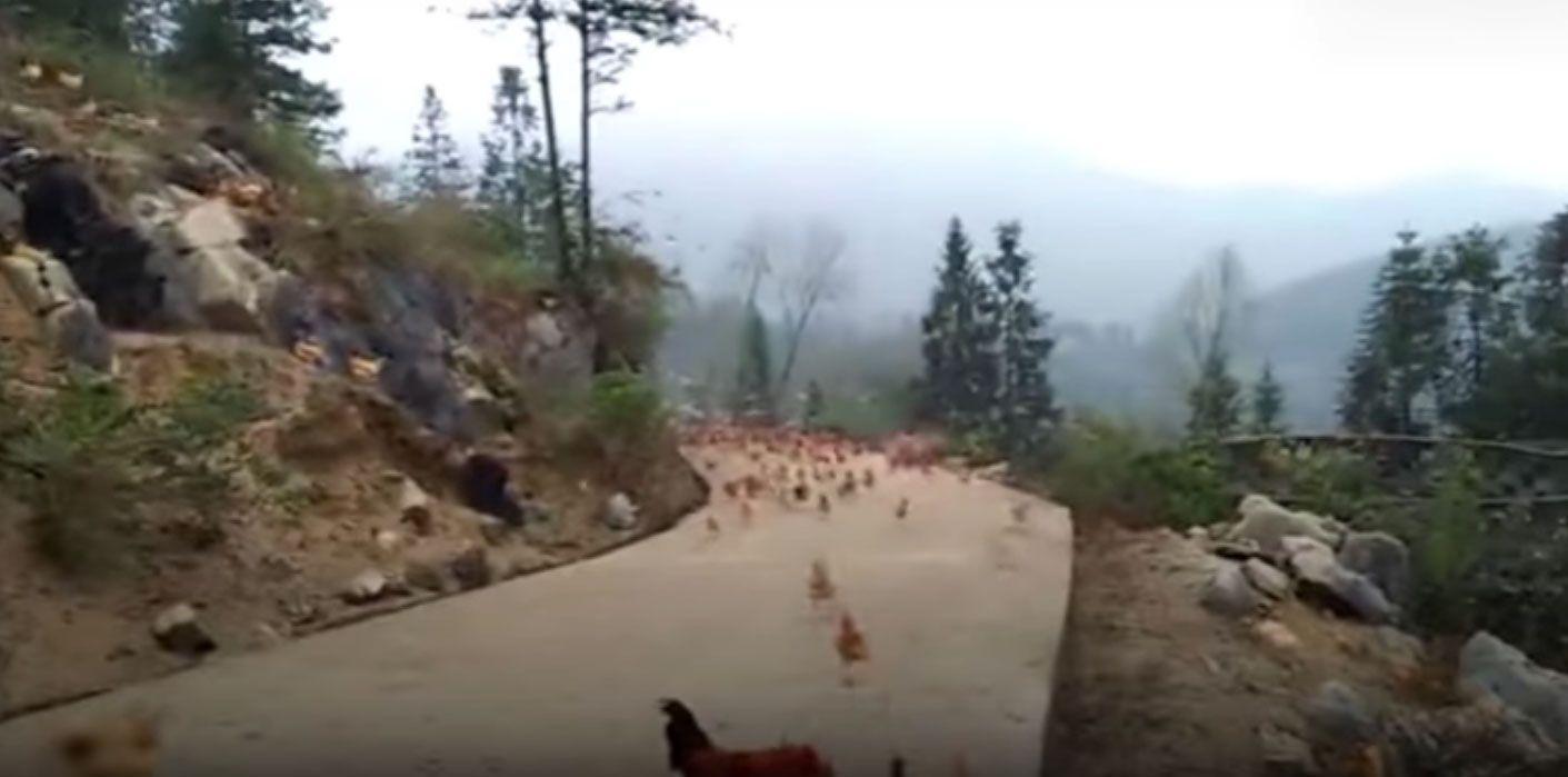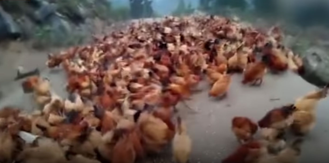 When the chickens hear the farmer blowing on the whistle, they come down from the hill in all sorts of directions quickly and start to gather on the road.