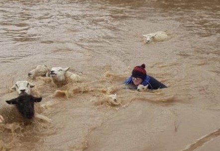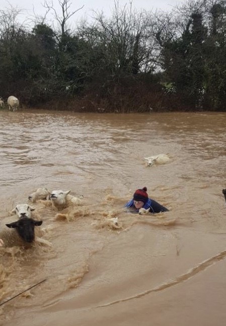 Faye did not think twice and jumped to the rescue when a neighbor said some lambs and sheep were in danger as they had been caught up in the fierce torrents.