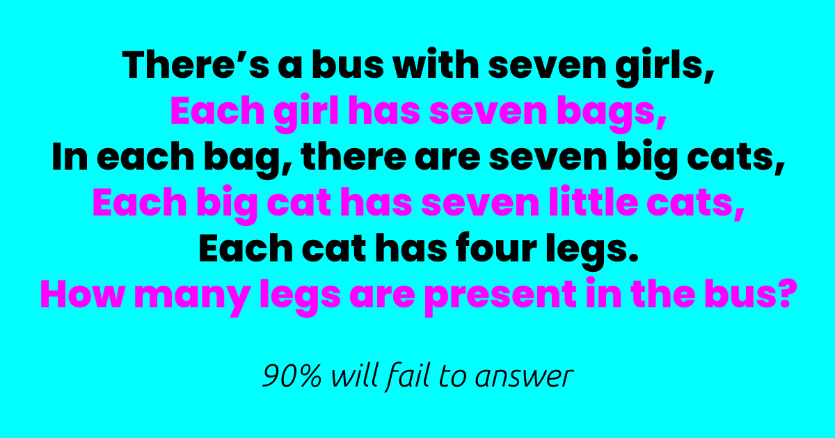 Remember, all you need to do is figure out how many legs are present on the bus, in total. Can you do it in less than a minute? We hope so because that’s the time to beat!