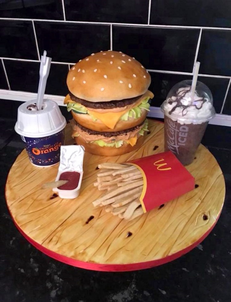 Although her cakes are made out of the usual baking ingredients, she has nifty tricks to turn her baked goodies into the trademark fast-food look that customers love.