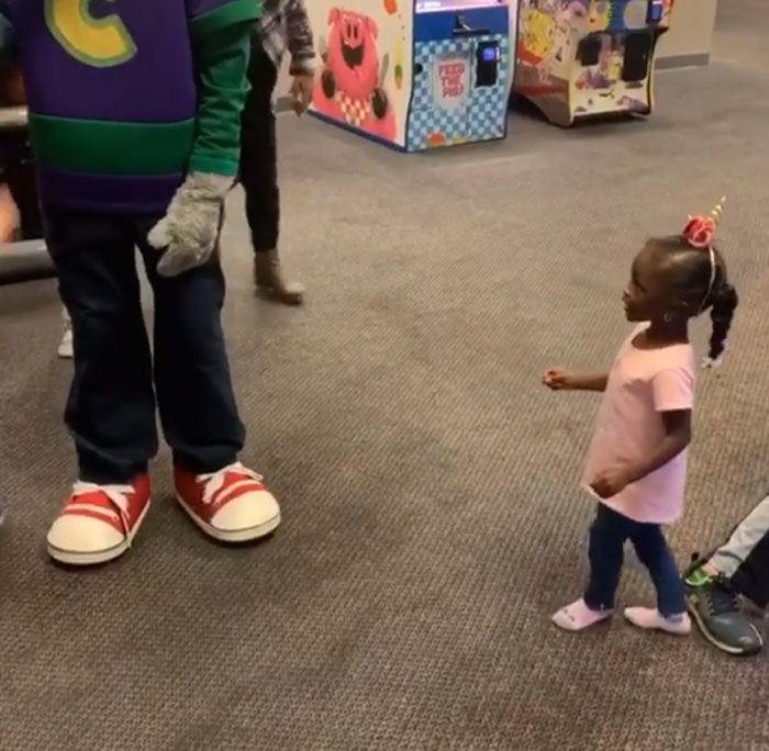 But, Chuck E ignored her. The father can be heard telling his daughter in the video: “go in front of him, go ahead.”