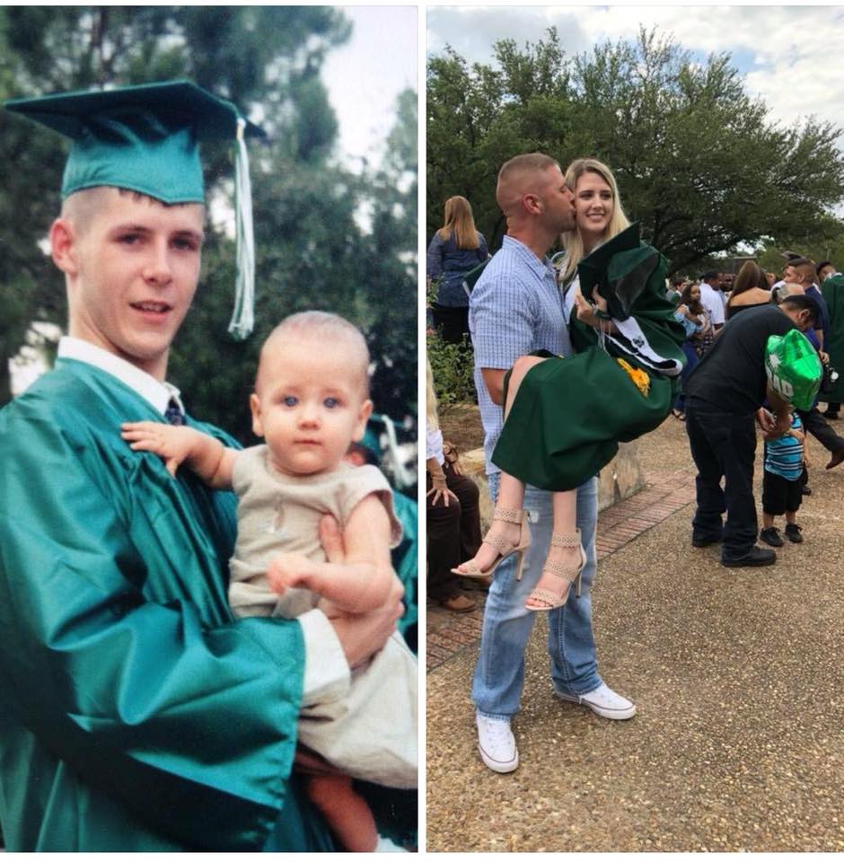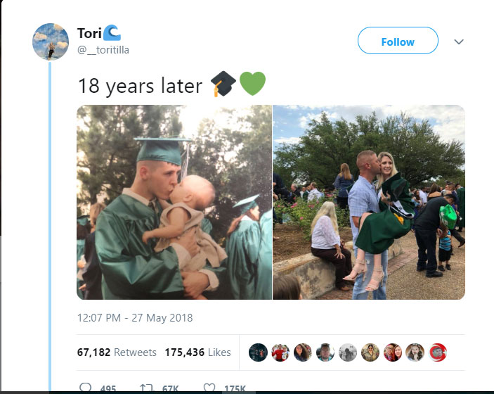 Tori Roach, 19, posted a picture of her big day in May 2018 on Twitter when she graduated from Huntsville High School in Texas, and she also honored her father with a throwback picture, where the little Tori can be as a baby in her father’s arm as her father celebrated his own graduation day from the same school in a green cap and gown.