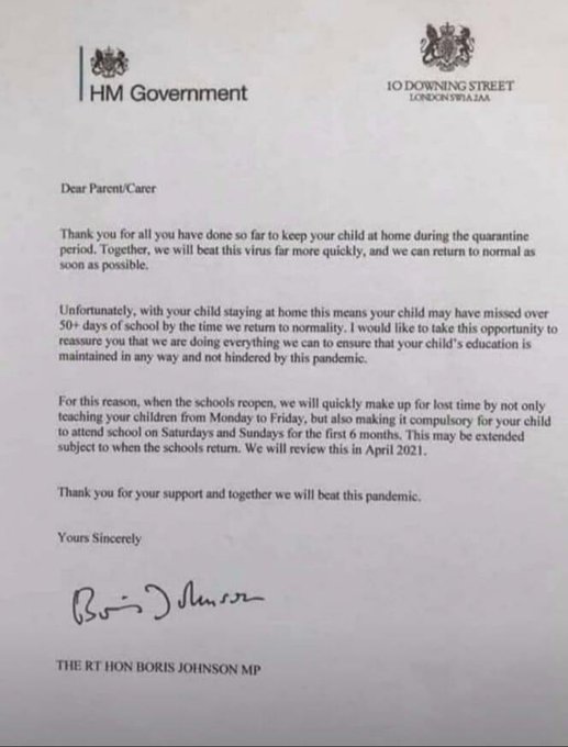 It was actually a mocked-up letter which Liam found online and it reads: “When school’s reopen, we will quickly make up for lost time by not only teaching your children Monday to Friday, but also making it compulsory for your child to attend school on Saturdays and Sundays for the first six months.” Chilling stuff for kids.”