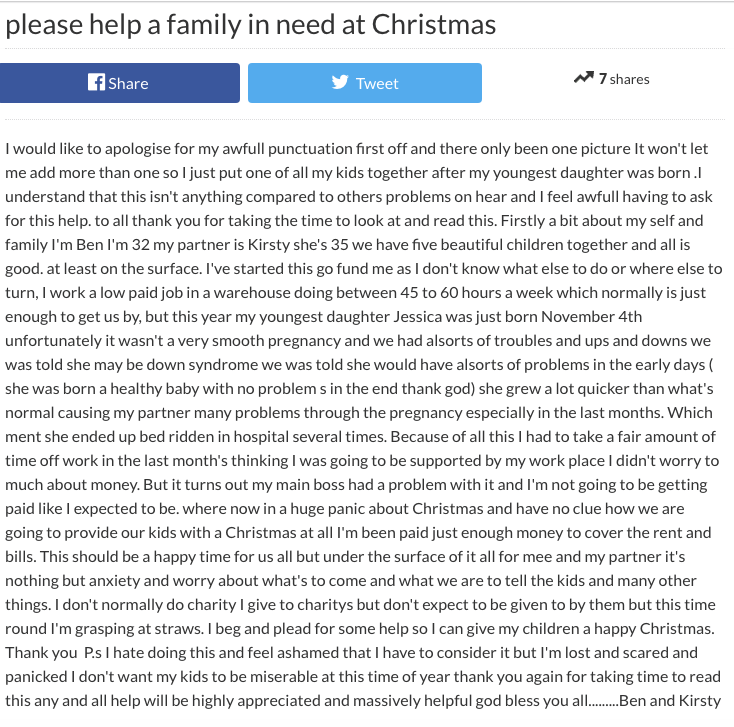 32-year-old Ben Buckley feared he wouldn’t have enough money to buy Christmas presents for his family so he decided to set up a GoFundMe page, hoping to raise £2,000 or $2,500.