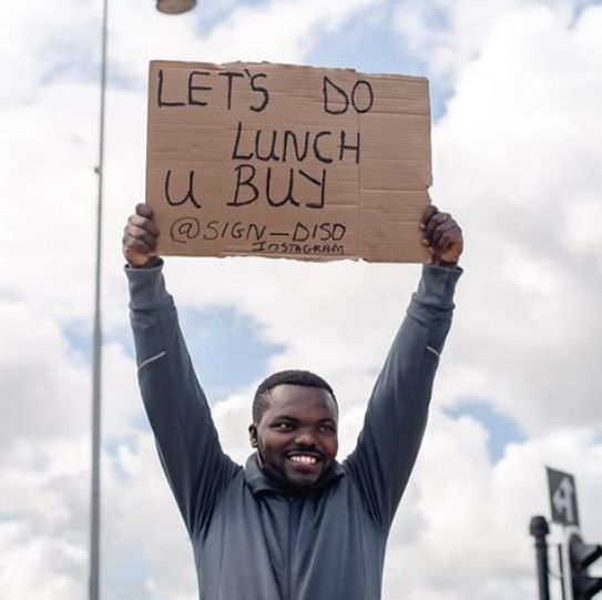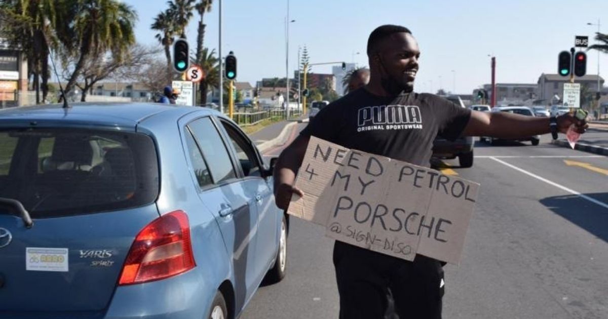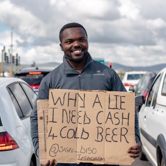 Nowadays, Malgas often takes to the streets armed with hilarious signs in an attempt to make people smile and earn some money in the process.