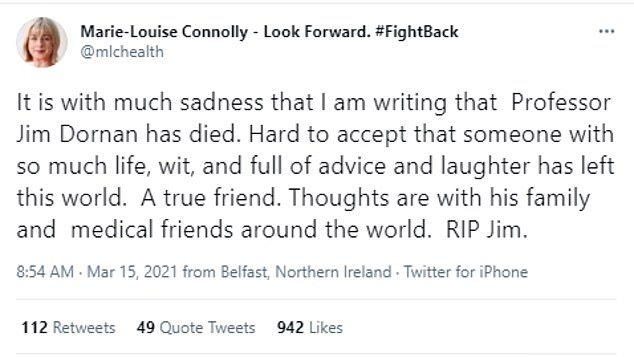 Leukemia and Lymphoma NI confirmed the devastating news on Twitter, writing: “Very sad news this morning on the passing of Professor Jim Dornan, a passionate patron, advocate and friend to all at @LAL_NI.”