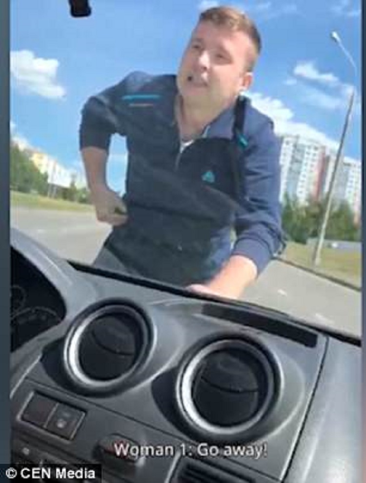 The woman steps slightly on the accelerator, forcing the man to step slightly back. With an exasperated laugh, the father takes something from his pocket and starts hitting the windshield.