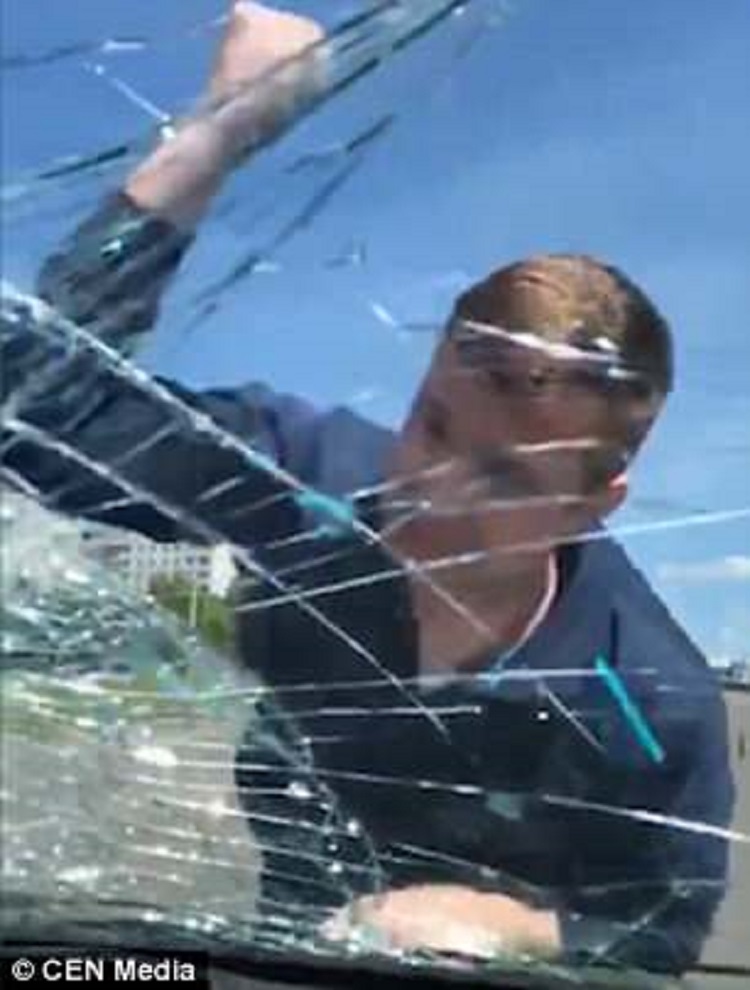 The father then proceeds to the driver’s side window, smashes it, then reaches in to shut the engine before switching the power locks to unlock the doors while the ex-wife numbly watches.
