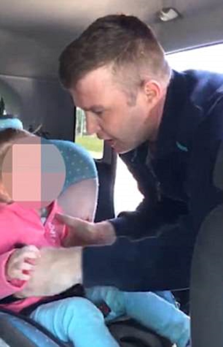 The dad then quickly opens the back door and reaches for his daughter while trying to calm her down. A bystander comes over to the car but doesn’t do anything to stop the father.