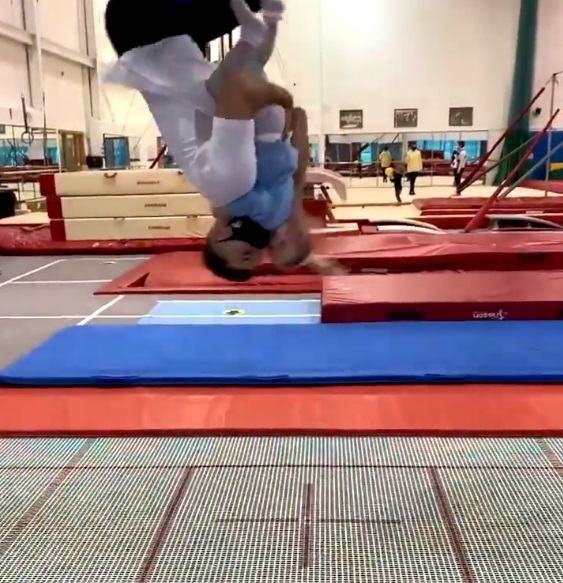 In one of the recent clips that he captioned “when my wife isn’t looking,” the young man performed a somersault while on a trampoline with his daughter in his arms.