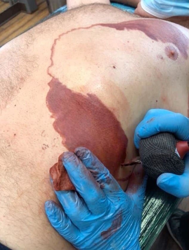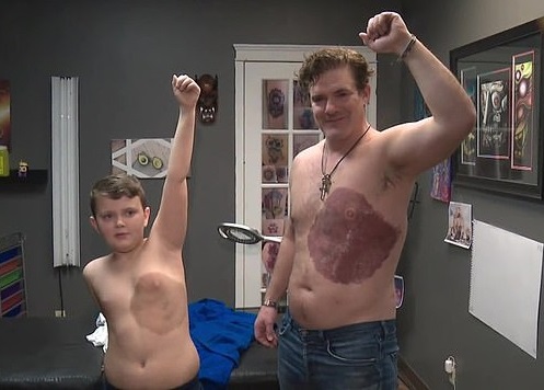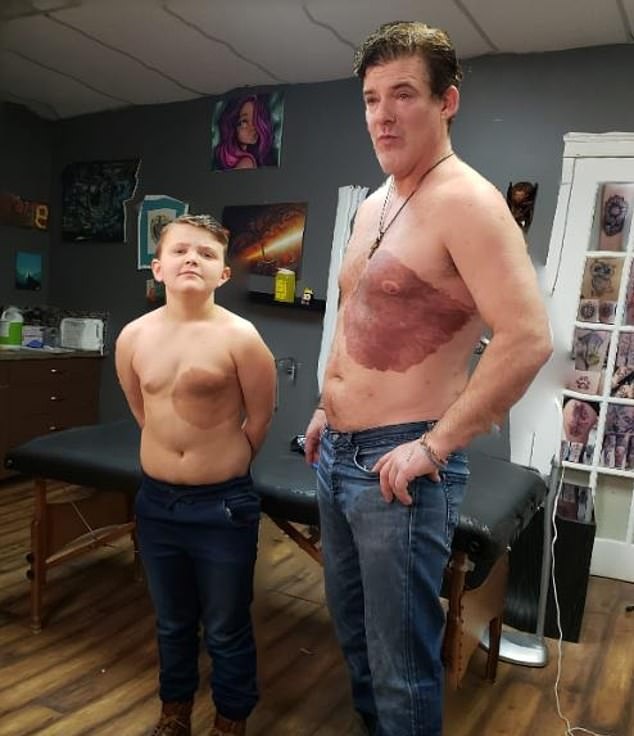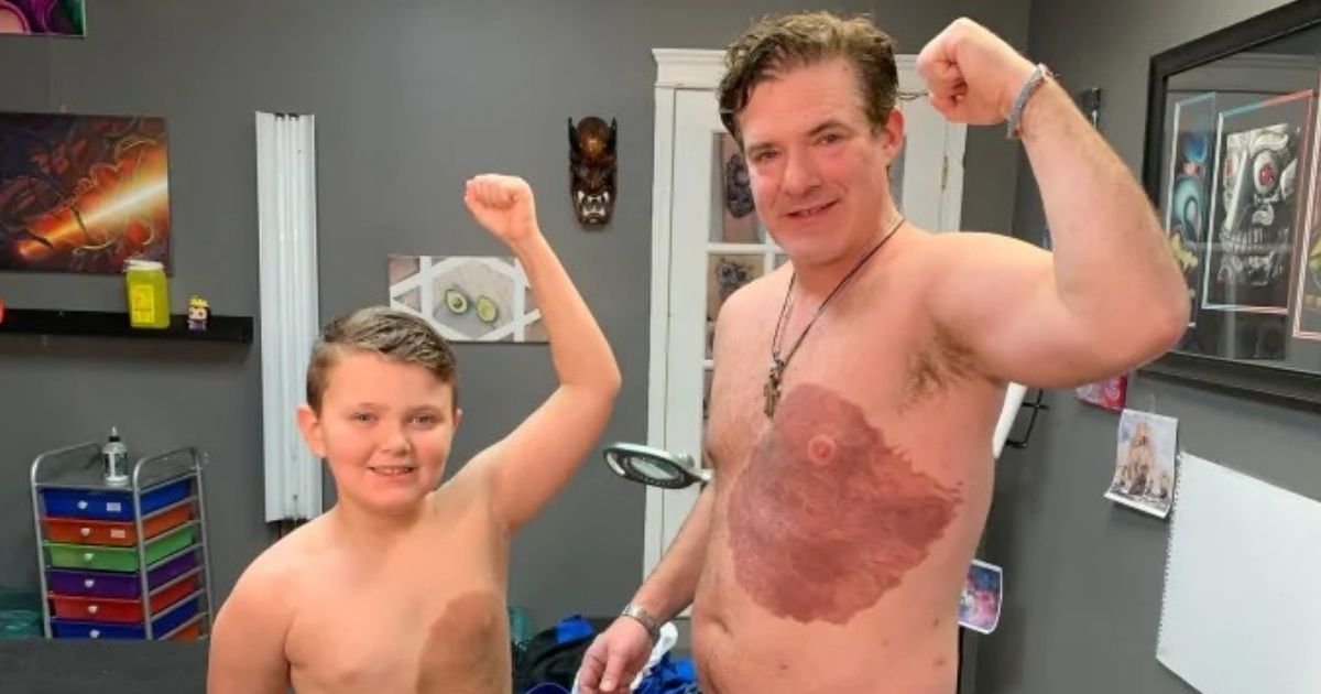 Seeing his son struggle with self-confidence, the dad decided to undergo a grueling nine-session procedure to get a large tattoo across his chest and ribs.