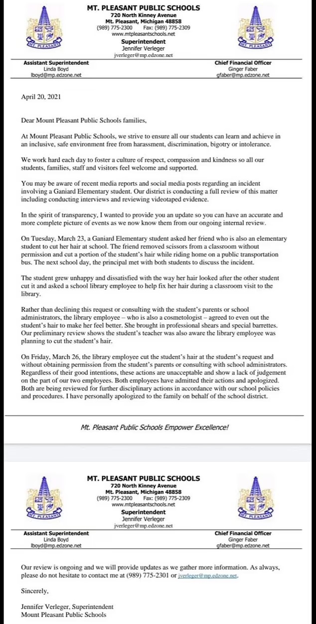 In July, after the father’s story first went viral, the Mount Pleasant Public Schools Board of Education confirmed that the librarian was reprimanded for cutting the child’s hair without her parents’ permission.