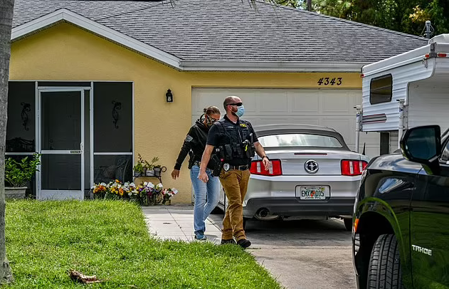 One hour after the FBI left, Laundrie’s father Christopher went out to check the mail. He then shook his head as he returned inside after demonstrators outside the house shouted the word ‘murderer’ at him.