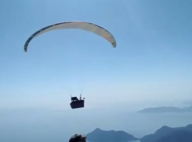 The fearless paragliding instructor flew to the skies in Oludeniz in southwest of Turkey on July 2, filming the unbelievable stunt as onlookers were left shocked and amazed.