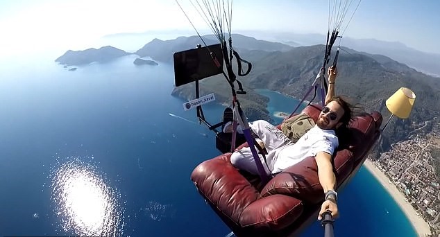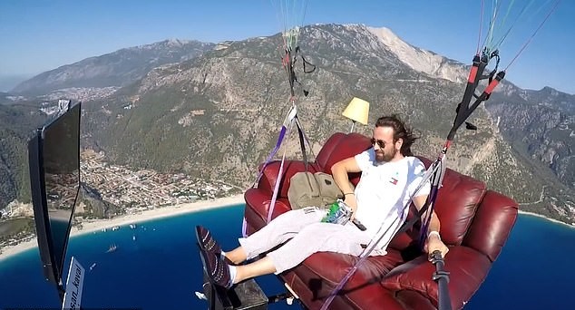 A brave man took to the skies on a sofa while watching TV and eating chips without being strapped in.
