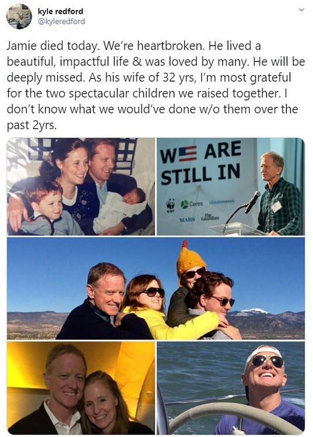 “It is with profound sadness that we grieve the loss of James Redford, our Co-Founder, our inspiration and our friend,” Tidman wrote in an Instagram post.