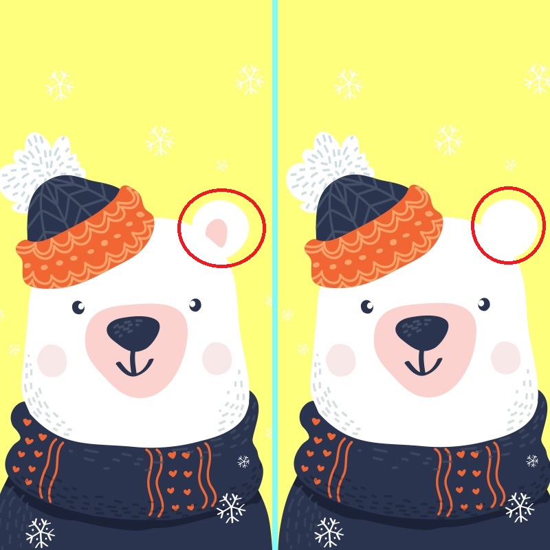 To spot the difference, you should stop looking at that sweater. It is the same in both pictures. Instead, focus on the bear!