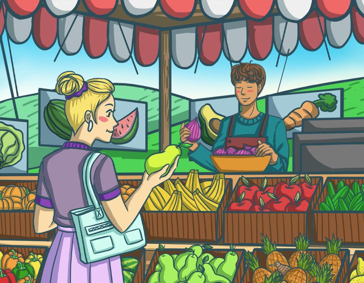 Let’s begin. Take a look at this picture of a fruit and vegetable stand and see if you can spot the kiwi!