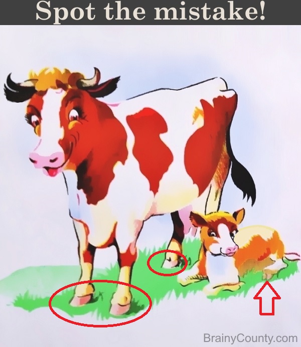 If you’re still looking for the mistake, try looking at the calf first. There’s nothing wrong with the calf. But you might want to check in what way the calf is different from the cow next to if you hope to spot the error.