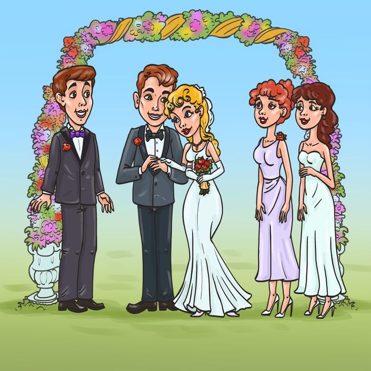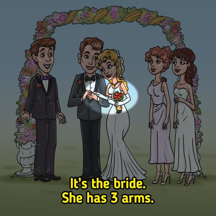 While the bridesmaids sure do look a bit suspicious, they’re definitely not aliens. Perhaps, they just have a secret crush on the groom. How about the groomsman? Do you see anything odd about him?