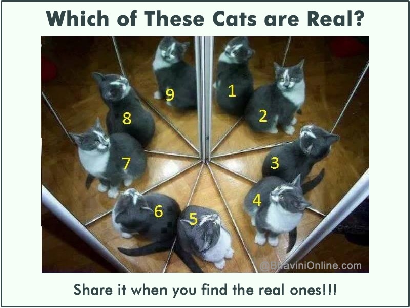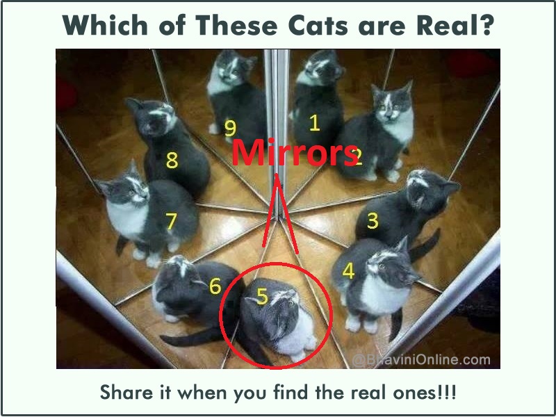 This also means that cat number 5 is the only real cat in the photo. Since it is surrounded by mirrors, all other cats are nothing but a reflection of the real deal.